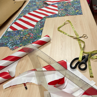 Design decided, I now collected some pattern shapes to use as blocks to create patterns for the dress design. This dress is an easy fit style, and this particular fabric is quite see through so I plan to wear a light cotton knit slip dress or my swimmers underneath. It is a straight through design which can be worn loose, belted or open like a coat. So my patterns will be on the larger side with plenty of extra fabric allowed for float and flow.